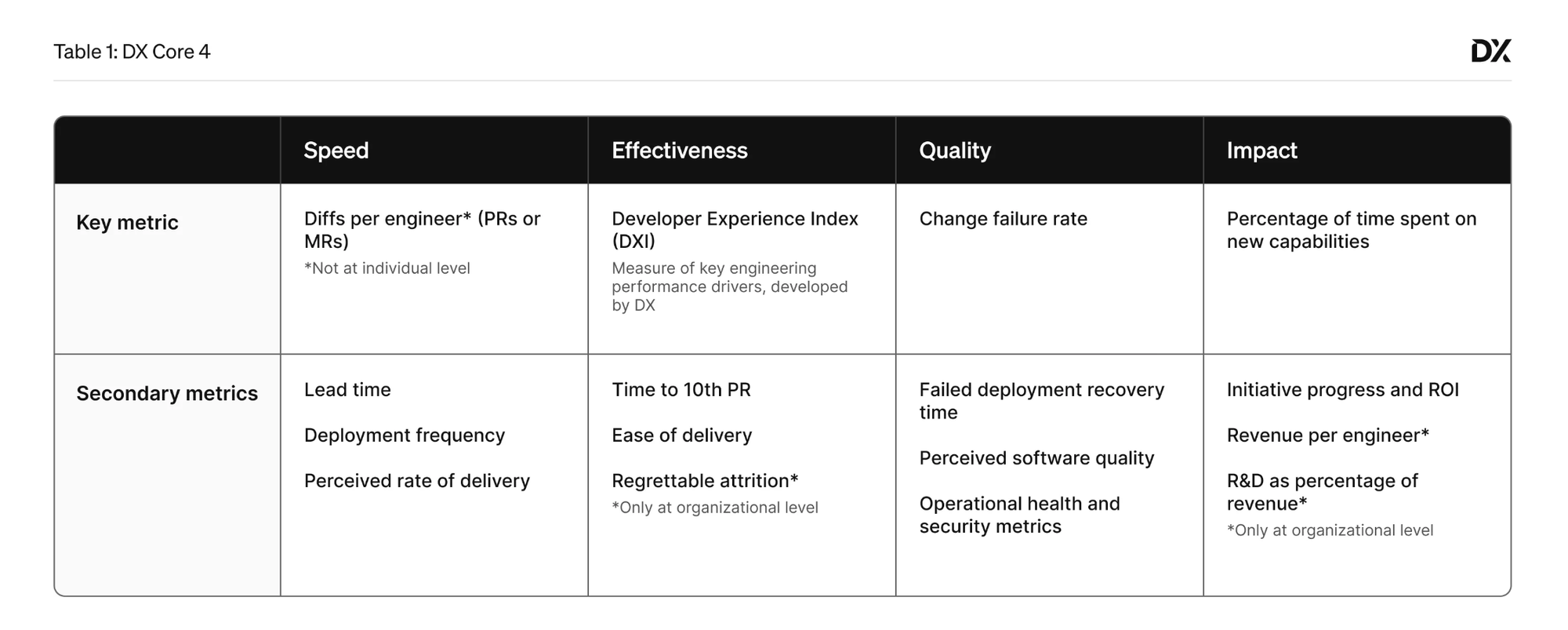 A critical aspect of DX Core 4 is that it works at all levels of the organization. From CEOs wanting to understand engineering efficiency to team leads looking to remove bottlenecks, these metrics provide meaningful insights without becoming vanity metrics.