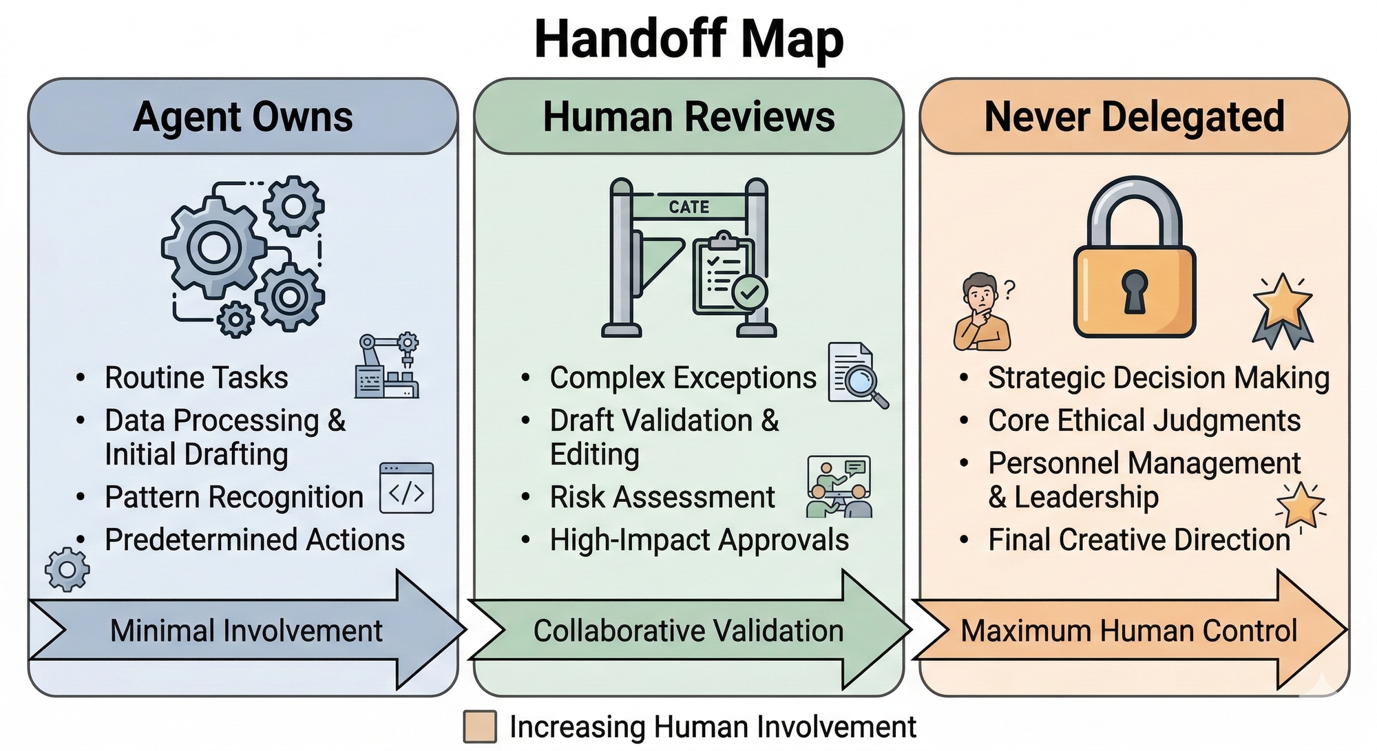 - What never gets delegated the decisions that stay human, full stop, regardless of how capable the agent becomes