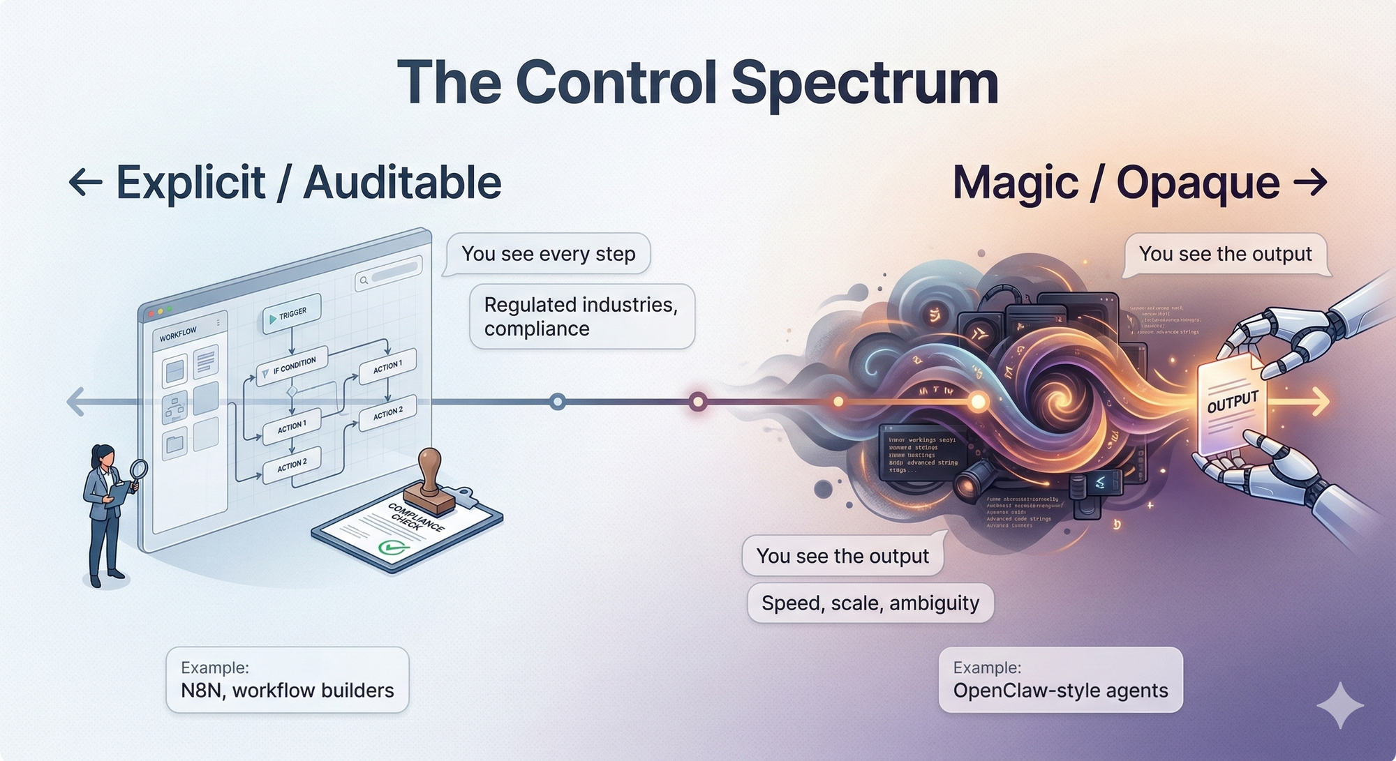 The organizations that get this right aren't picking one end of the spectrum and committing. They're running explicit, auditable workflows for anything that touches compliance or customer data - and deploying autonomous agents where speed and ambiguity tolerance are high.